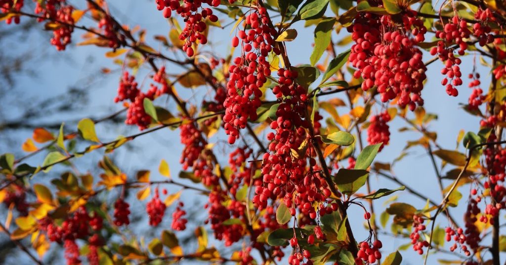 Berberis jamesiana’s berries are vibrantly colored and the foliage is beginning to turn orange. It’s a rich combination that lasts quite a while. The birds hang out in this very large shrub a lot this time of the year, I think they do so for its protection though I have spotted some birds eating berries.