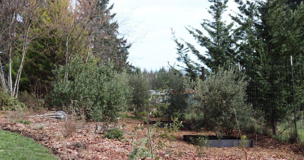In early 2016, some of the very first plants I put in the ground were these four Olea ‘Arbequina’. While they did die to the ground after a severe winter (2017/18), they did regrow from the roots. We’ll see them a bit later. This is looking east.
