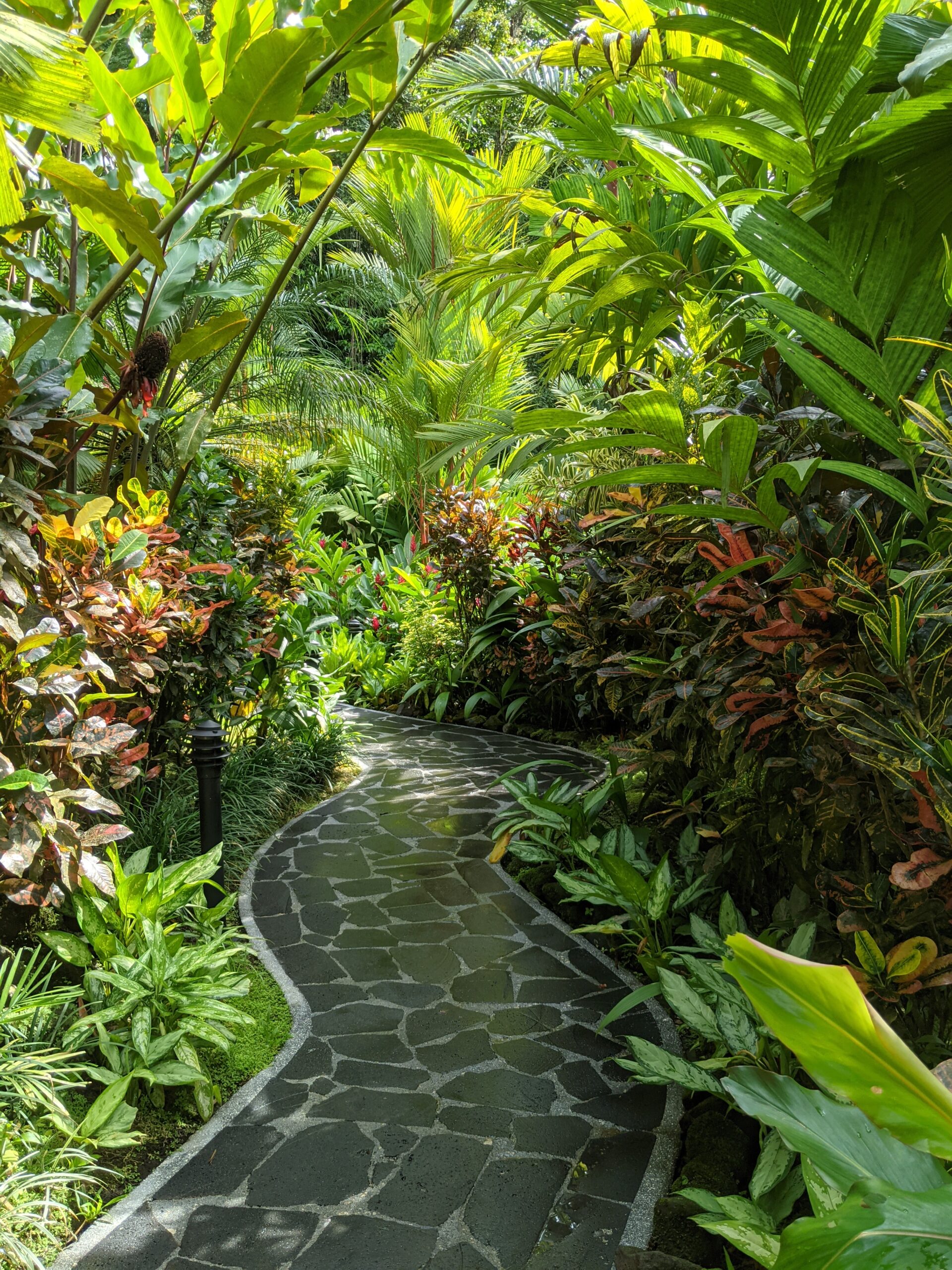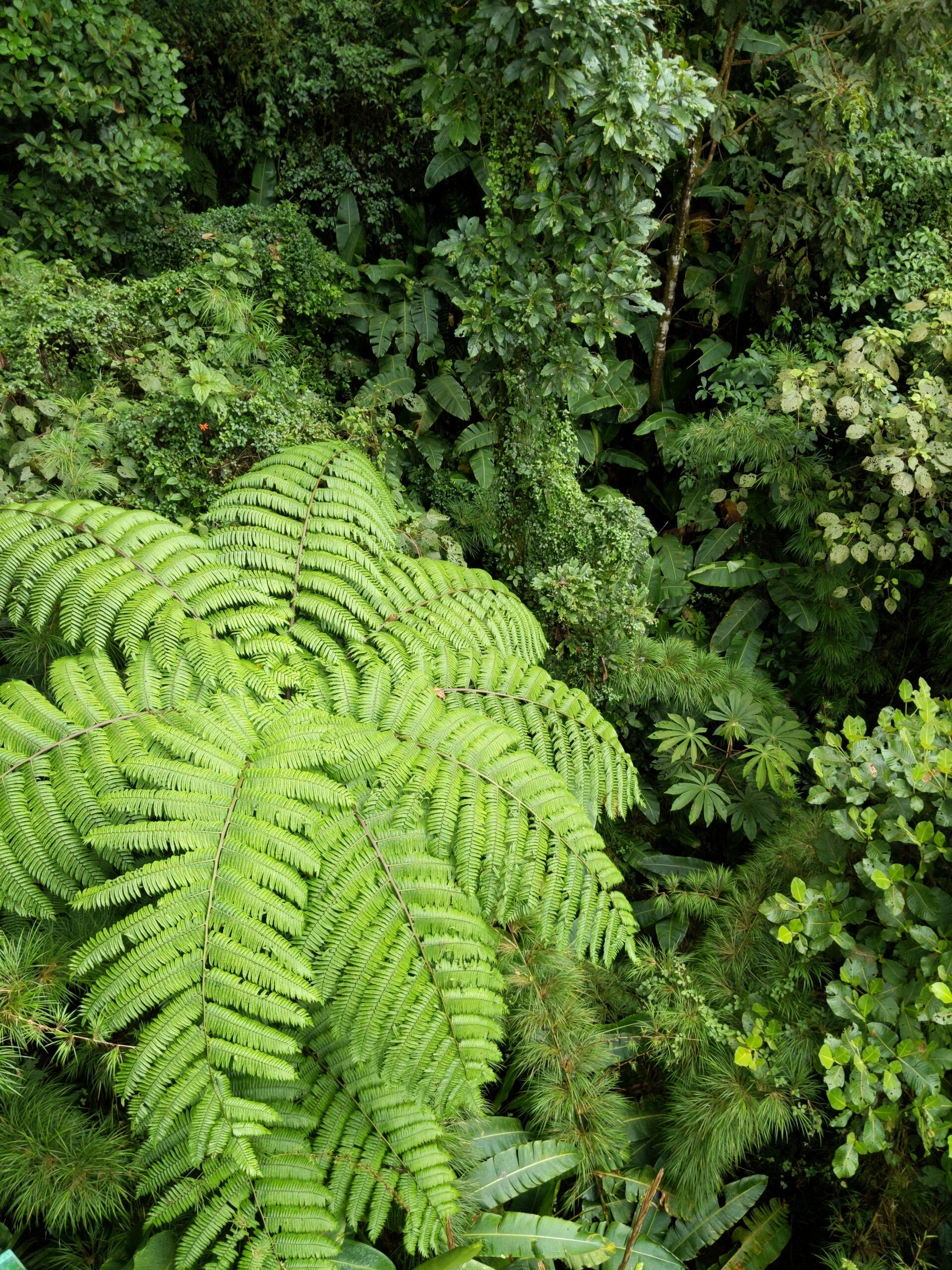 Looking down from the walkway, you get a clear view of the lower canopy—a perfect study in how powerful texture can be in garden design. The giant tree fern (Cyatheaceae sp.) spreads its lacy fronds above the soft, needle-like foliage that resembles a Caribbean pine (a best guess—feel free to correct me if you recognize it). Around them, the broad, paddle-shaped leaves of banana (Musa sp.?) and the palmate foliage of Cecropia add even more contrast and visual interest. Do you recognize any other of the plants in this shot?