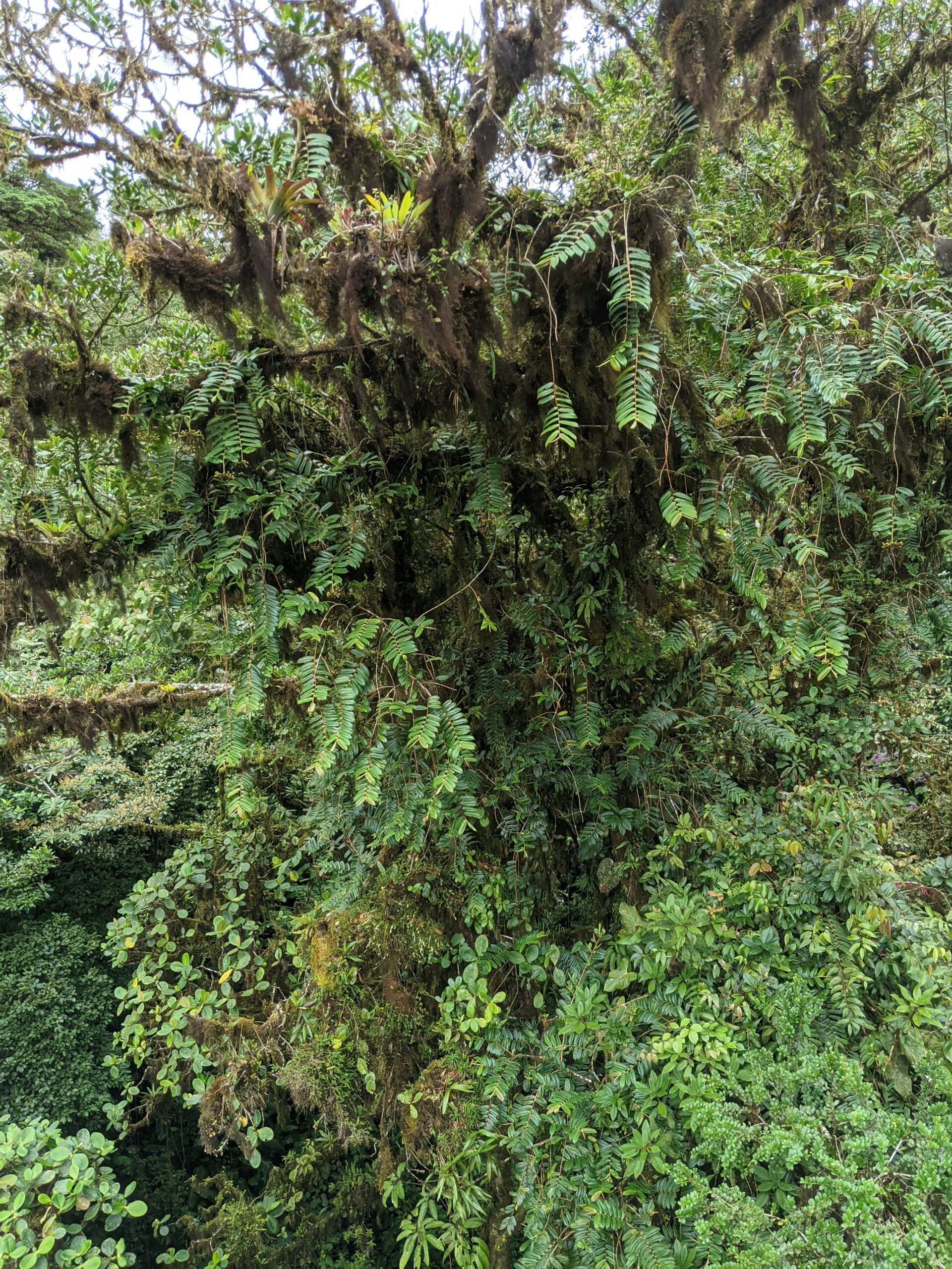 Costa Rica’s cloud forests are famous for their astonishing plant diversity, and Monteverde is no exception. During a treetop excursion— crossing suspension bridges and ziplines through the canopy — we saw firsthand how life layers itself in these misty heights. In this photo, every surface is alive: the host tree (species unknown!) is draped in mosses, epiphytes, and ferns, while philodendrons, monsteras, and anthuriums climb and compete for space and light. Epiphytes are plants that grow on top of another without taking nutrients from that plant. Species such as bromeliads, orchids, and many ferns are epiphytes. Epi means “upon” or “on top of’ and phyte means “plant”.