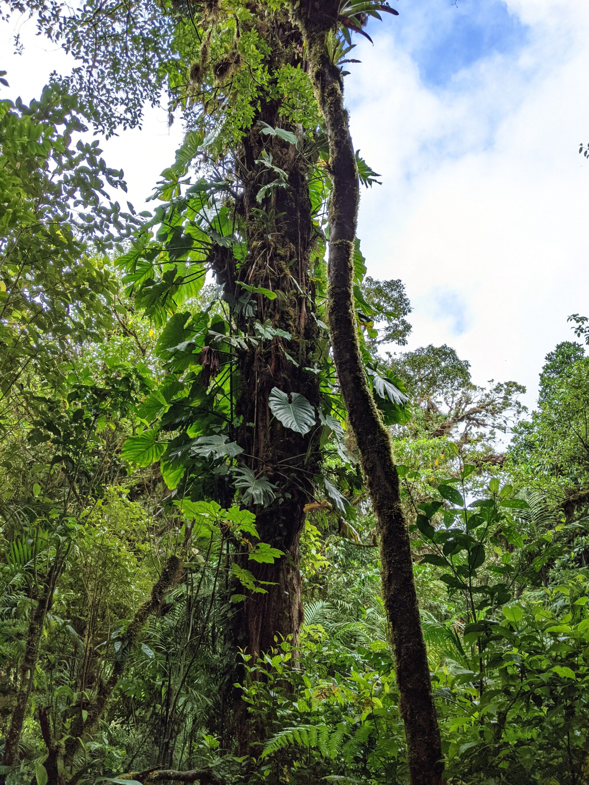 Here we see a large-leaved aroid, possibly Philodendron giganteum, climbing up a tree. Cloud forest trees are often draped in hemi-epiphytic aroids. A hemi-epiphyte is a plant that spends only part of its life as an epiphyte, shifting between growing on other plants and rooting in the soil. Species such as philodendrons and monsteras use this strategy to reach better light in the canopy while still accessing nutrients from the forest floor when possible.