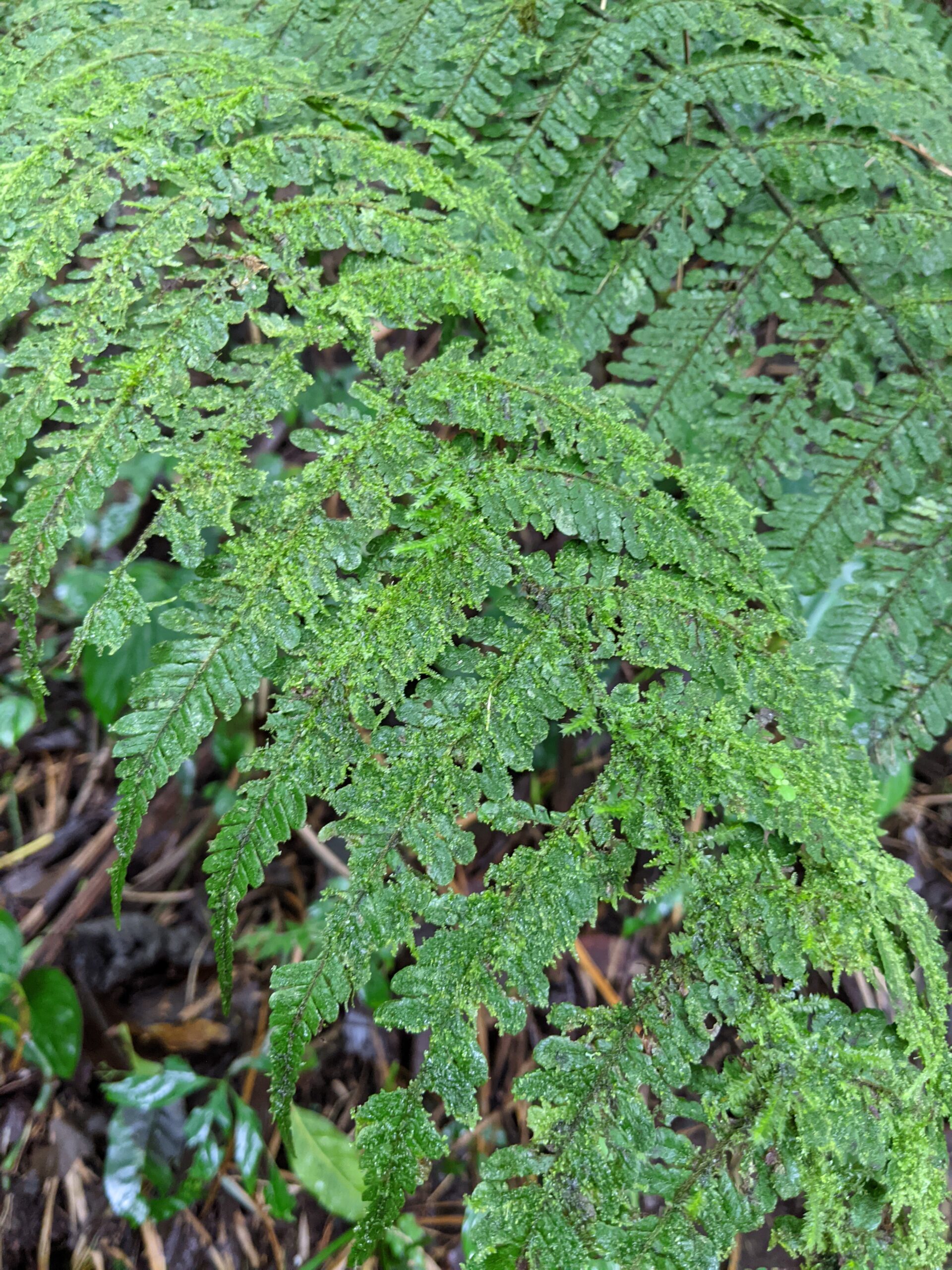 Another example of the diversity viewable in even the smallest of spaes. Here, this is a tree fern frond (Cyatheaceae sp.) is covered by mosses, lichens, and possibly small filmy ferns.