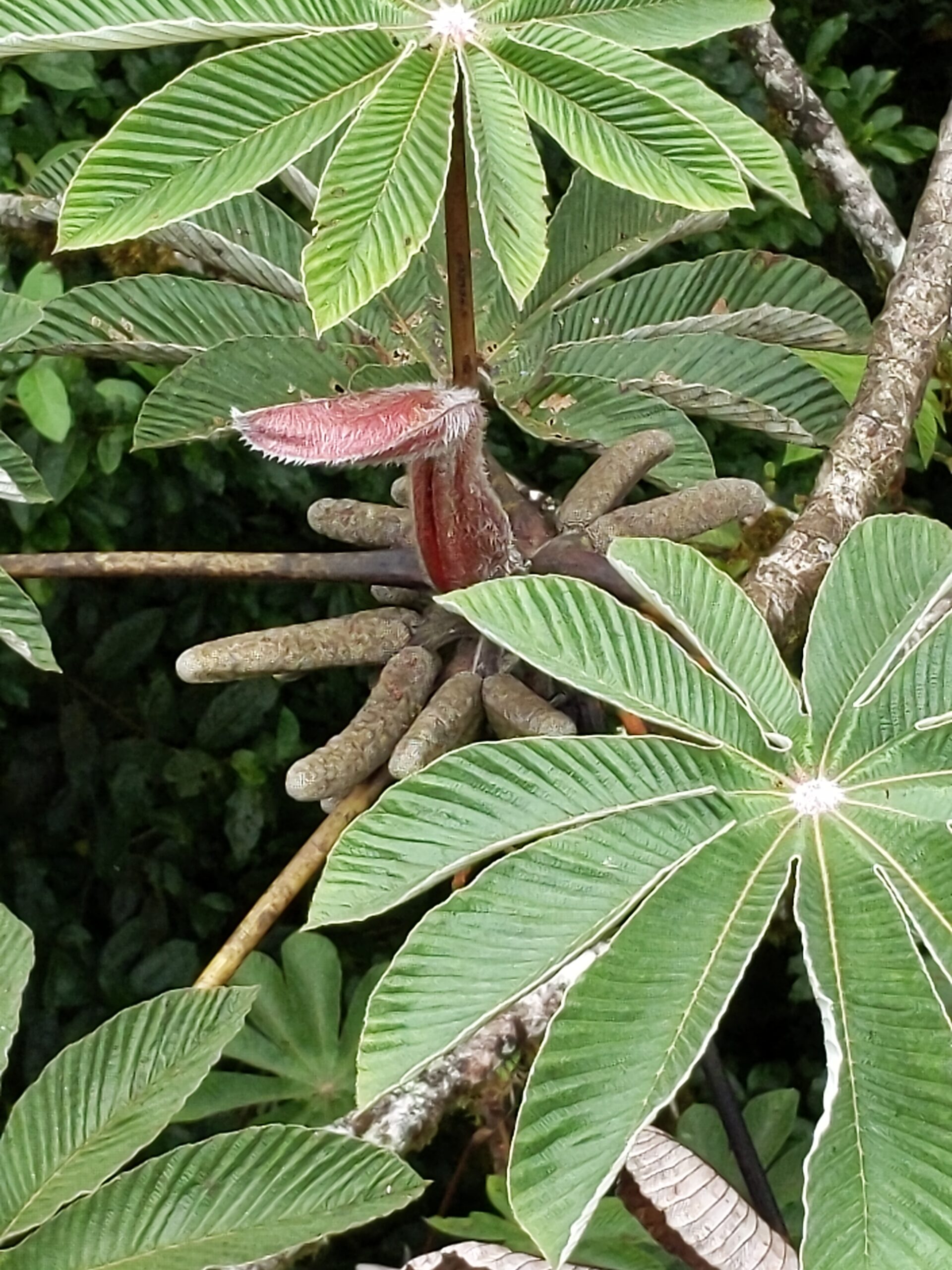 This close up is of a plant in the Cecropia species — likely Cecropia insignis or Cecropia obtusifolia. Cecropia is one of the most iconic Neotropical trees. The features are textbook large palmately lobed, silver-backed leaves, central clusters of long, fingerlike catkin-like inflorescences, hairy red/brown bracts at the petiole base. Cecropia trees are keystone species in Costa Rica — home to Azteca ants and many epiphytes.