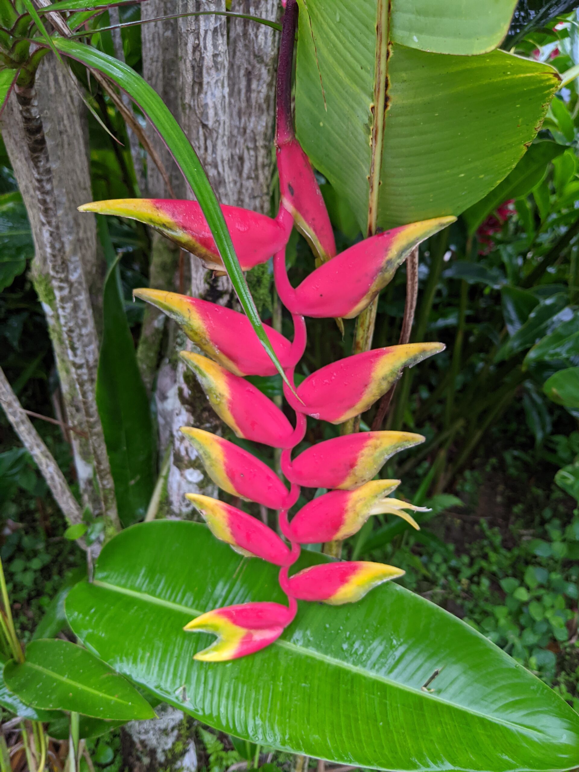 - Heliconia (likely Heliconia rostrata or H. latispatha) – Large, broad banana-like leaves on the left side. These plants are extremely common ornamentals in Costa Rica and frequently planted along paths.