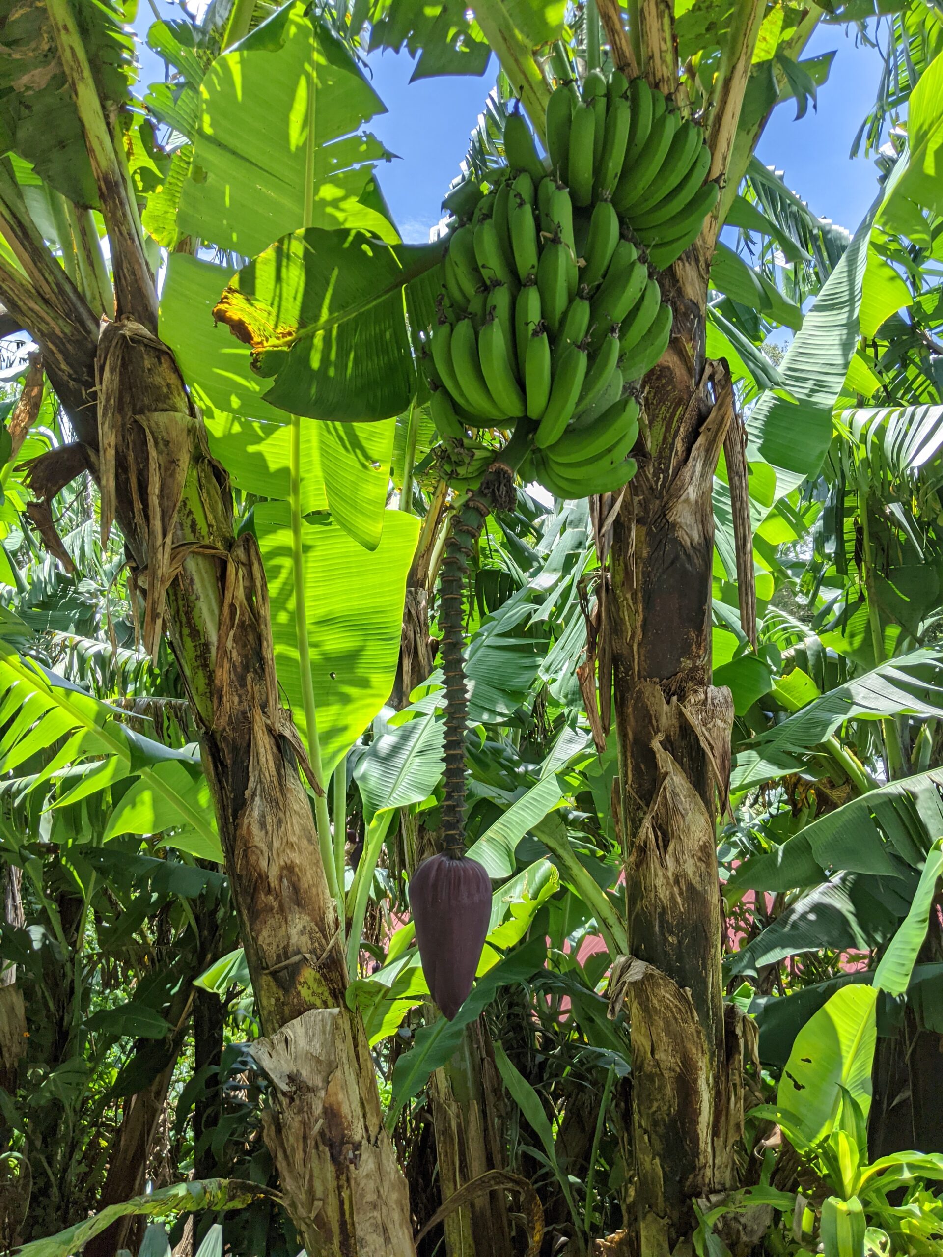 This is a cultivated banana (Musa × paradisiaca / Musa acuminata group), which is common in Costa Rican gardens, farms, and smallholdings. A mature banana bunch can be seen towards the top of the tree, and below it, the large purple inflorescence bract (the banana flower or “banana heart”) hangs down.