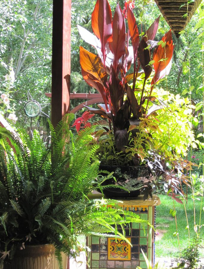 When your containers are as creative as Leslie’s, a plain pedestal will not do. Colorful tiles add even more interest to her spaces and play off of the colors she plants above.