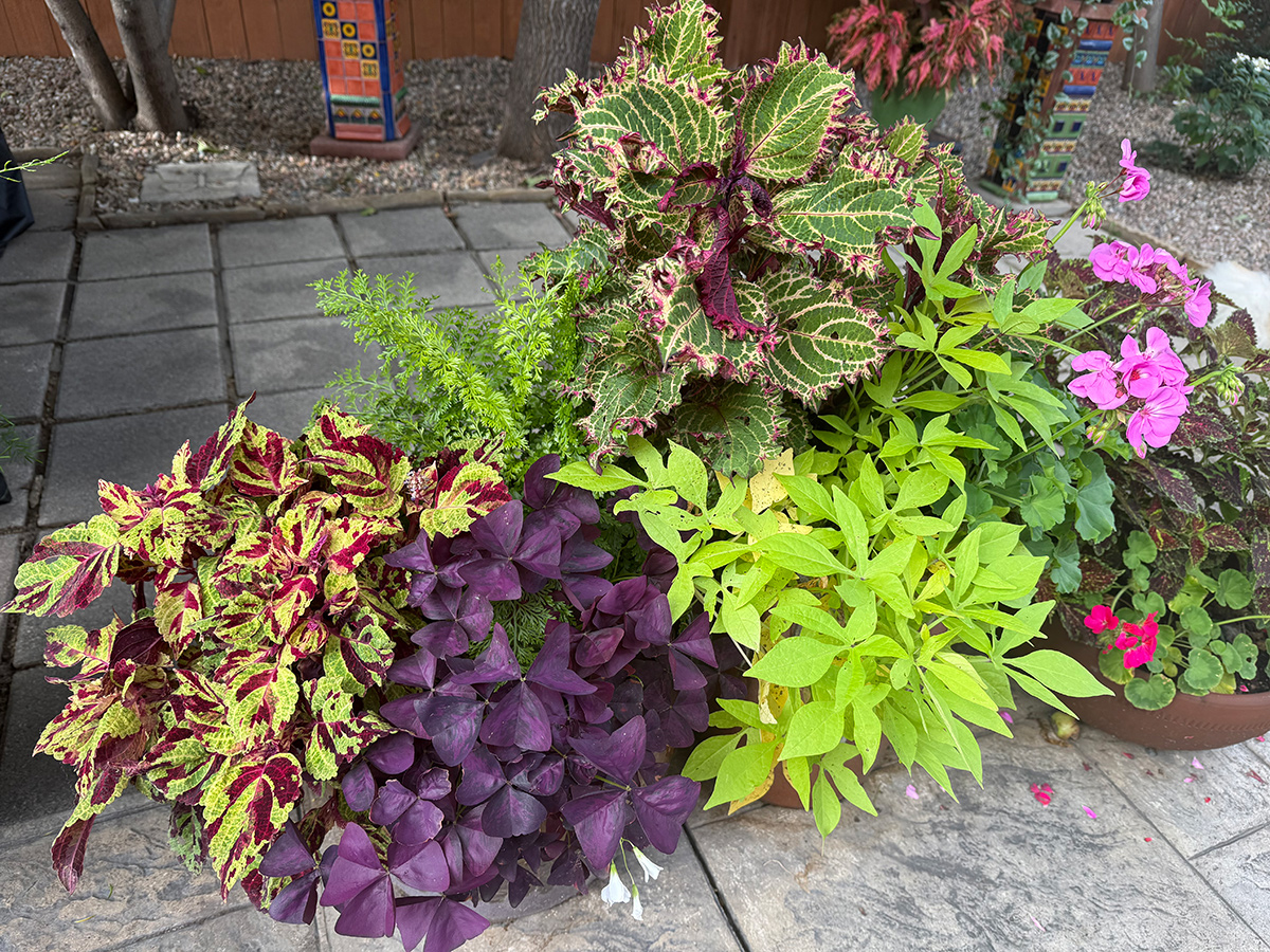 With foliage this colorful, who needs flowers? The purple shamrock (Oxalis triangularis, Zones 8–11 or as an annual), chartreuse sweet potato vine (Ipomoea batatas, Zones 9–11 or as an annual), and two tie-dye coleus in this container grouping are so vibrant that the pink geraniums to the right almost fade into the background.