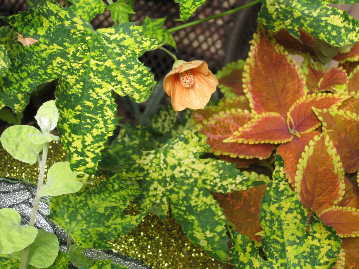 Leslie’s combinations are fabulous from afar and just as exciting in the close-up. Variegated flowering maple (Abutilon pictum ‘Thompsonii’, Zones 8–11 or as an annual) is a thrilling plant in isolation, with the sweetest bell-shaped blooms and incredible speckled foliage, but it’s made even more impressive with a coordinating coleus.