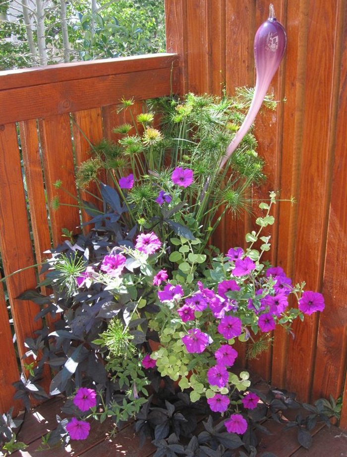 As we saw above, Leslie can create some marvelous purple plantings. This perfect purple-and-green design features: Graceful Grasses® Prince Tut™ dwarf Egyptian papyrus (Cyperus papyrus ‘Prince Tut’, Zones 10–11 or as an annual), purple petunias, ‘Blackie’ sweet potato vine (Ipomoea batatas ‘Blackie’, Zone 11 or as an annual), and a really cool water feature that adds a little extra height and pizzazz.