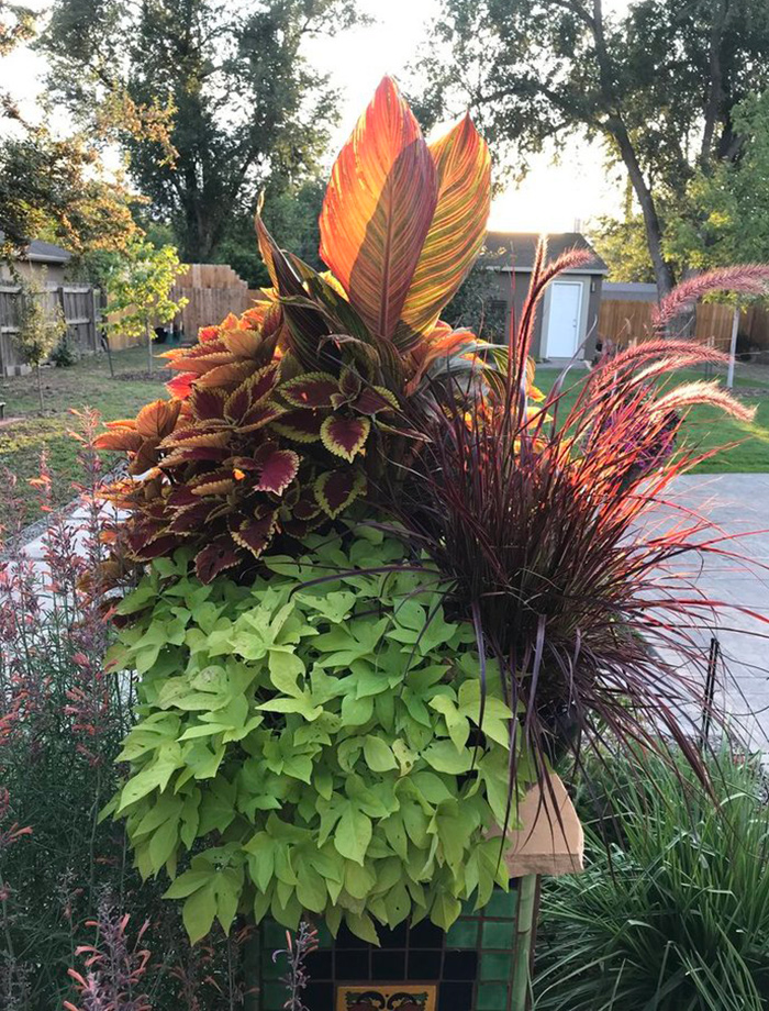 It’s more proof of the power of foliage, including the contrast and diversity that can be achieved with the right plants. Chartreuse sweet potato vine, purple fountain grass, coleus, and Tropicanna® canna (Canna ‘Phasion’, Zones 7–11) explode from all sides of this packed pot.
