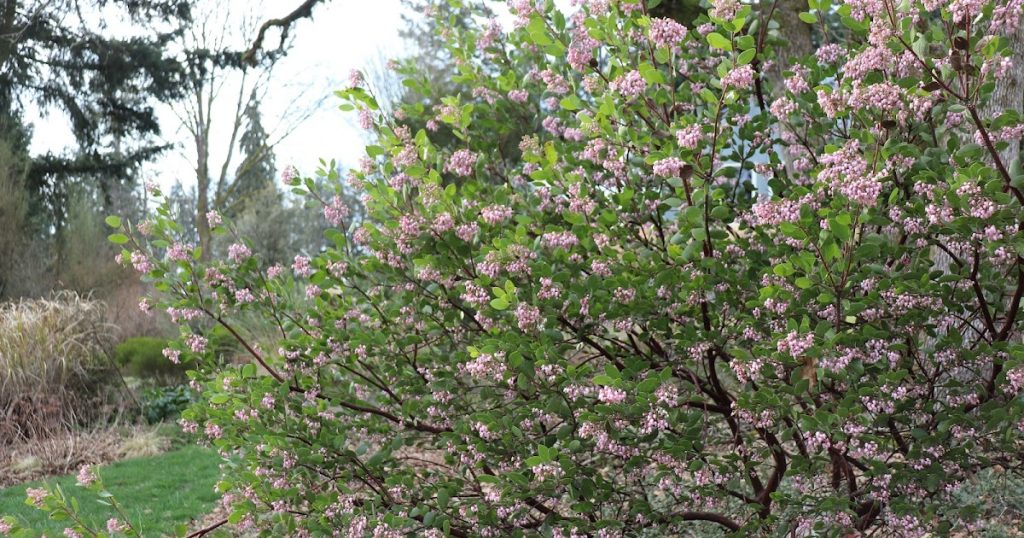 Oemleria cerasiformis, oso berry, is a native deciduous shrub that is super early to bloom. Here the white dangling flowers are just beginning to open up.