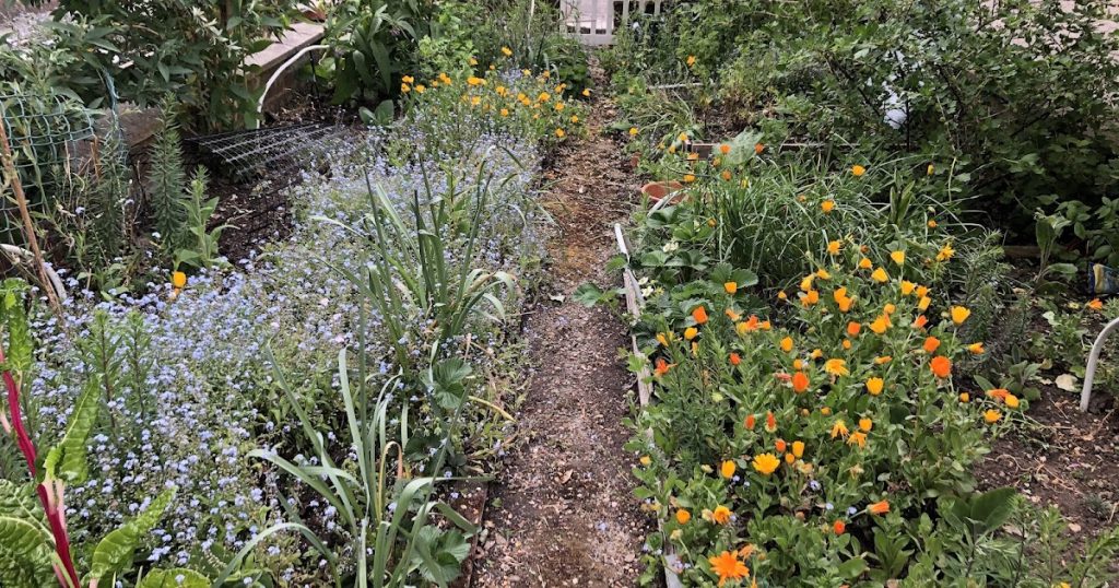Move on a few weeks and I now have to steel myself to ruthlessly remove (some of) the flowers in order to make space for some veg. The forget-me-nots can be pulled out once they’ve seeded themselves (thank you May winds) but the calendula, linaria and foxgloves will be keeping the bees and pollinators happy for a bit longer.