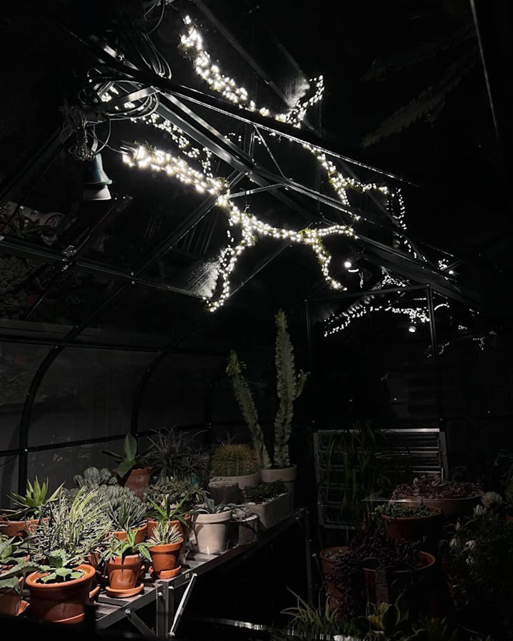 Hubby added a spot light for inside the greenhouse right after installation, but I wanted to add something pretty. I love the way the Europeans decorate their greenhouses with a chandelier. Our greenhouse has a lower ceiling with not much room for one, so we got creative and strung a long mossy branch with electric LED fairy lights and hung the lit branch with zip ties.