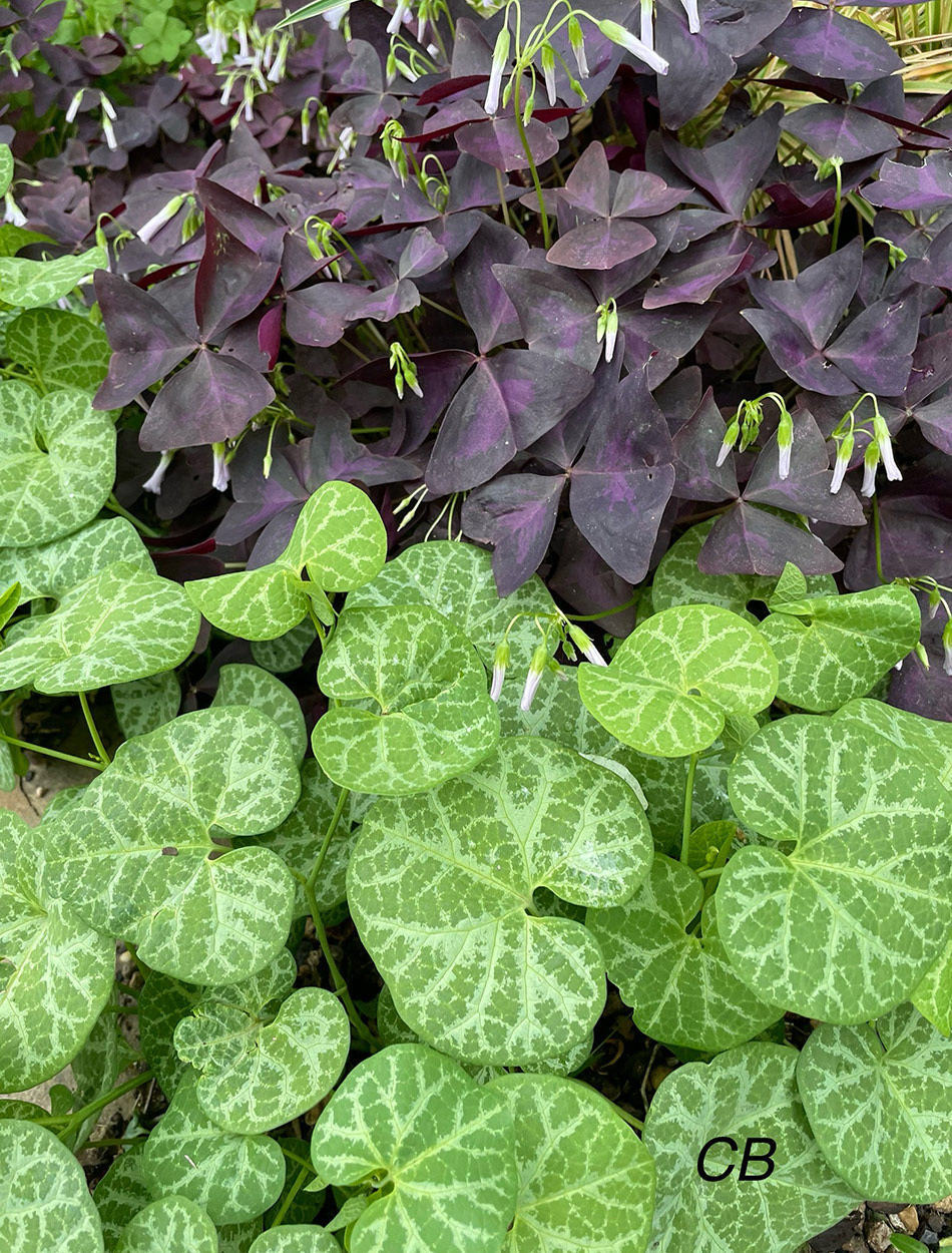 This photo shows purple oxalis (Oxalis triangularis, Zones 6–10) with white-veined pipeline (Aristolochia fimbriata, Zones 7–9). Each summer I get at least two full cycles of the beautiful black pipevine butterfly (Battus philenor) laying her eggs in these leaves. This is shortly followed by a tribe of little black caterpillars munching their way through every single leaf right down to the roots. Then the leaves grow back and the full cycle repeats.