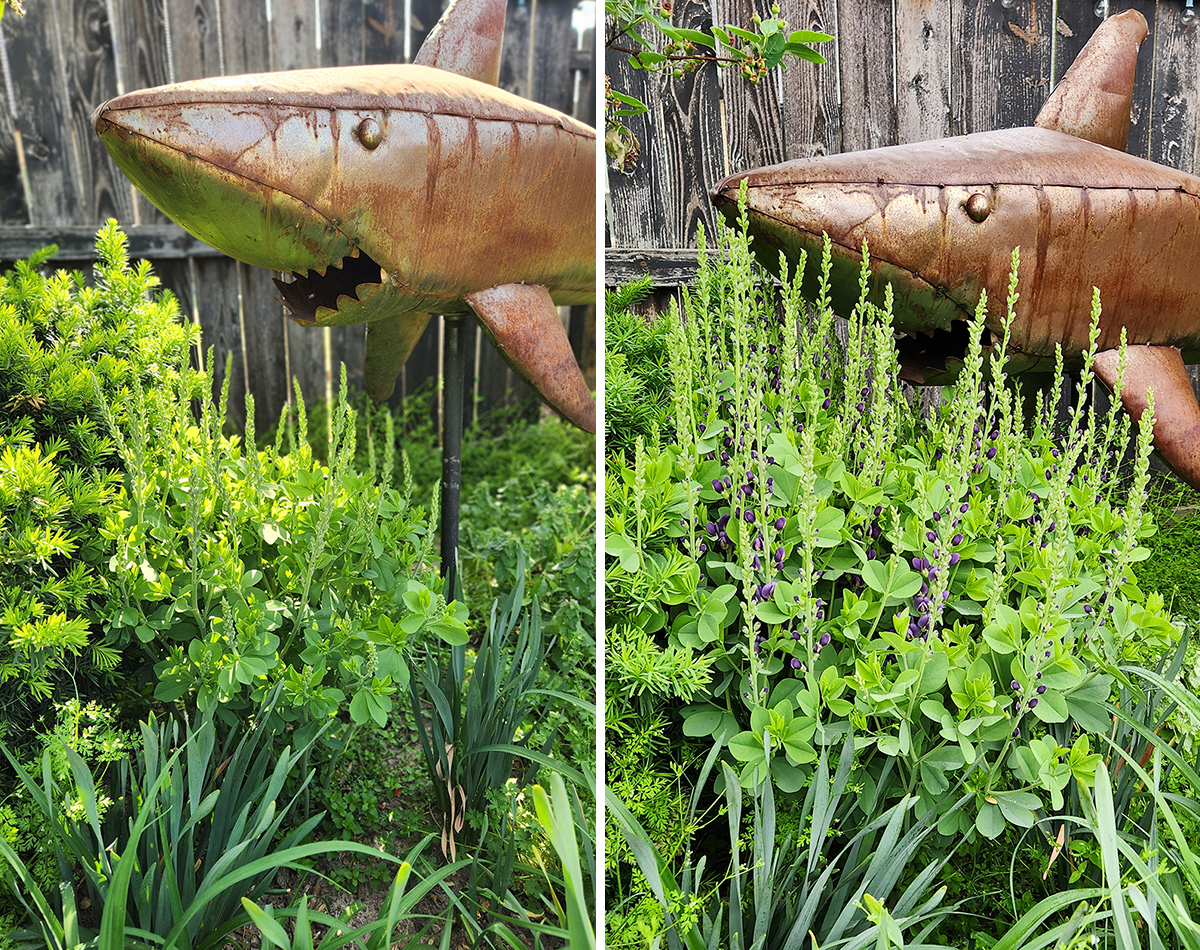 Continuing the violet, lavender, and white color scheme, my Decadence® Sparkling Sapphire baptisia (Baptisia ‘Sparkling Sapphires’, Zones 4–9) is showing mega growth in just one week. The above photo is from Friday, April 18…and here they are on Friday, April 25. Side note: I love how the baptisia makes it look like the shark is swimming through an ocean bed of seaweed!
