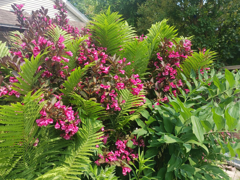Lee’s ostrich ferns with an incredible weigela in full bloom—potentially the cultivar Wine & Roses® (Weigela florida ‘Alexandra’, Zones 3–9), based on the dark burgundy foliage and bright pink flowers.