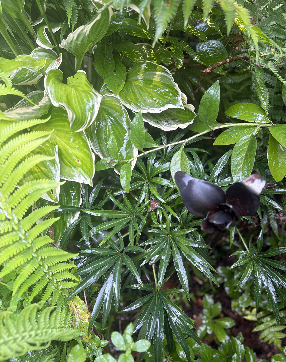 With all of that gloss, I’m assuming this photo was taken after one of the many heavy rains that Carla’s garden got in August. In her woodland garden, a tapestry of foliage comes together to create wonderful patterns and designs.