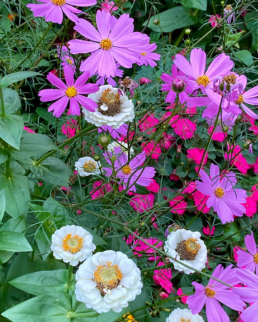Heidi has awe-worthy borders full of fantastic perennials, but her patio garden mainly consists of incredible annual plant combinations. White zinnias and pink cosmos are heavenly against a backdrop of bright pink impatiens.