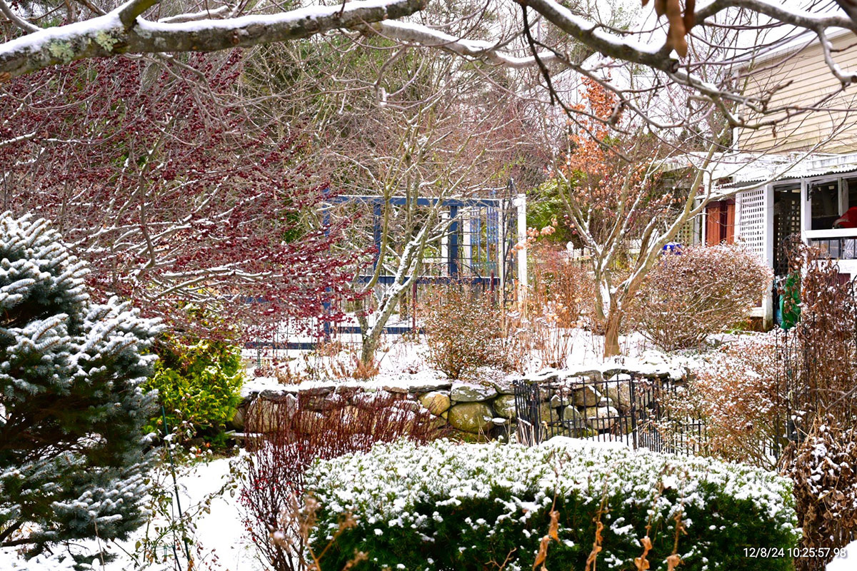 First up we have some seriously stunning winter scenes from Tingshu Hu and her husband Philip Zhao in Dunstable, Massachusetts (Tingshu’s Low Maintenance Garden in Massachusetts, Deedee, Lulu, and Luke in Tingshu’s Garden, Summer in Tingshu’s Front Garden, Summer in Tingshu’s Back Garden, etc.). Tingshu’s garden is full of vibrant color from the earliest days of spring straight through to the end of fall, but she kicked off the new year on the blog with a different perspective on their lush designs.